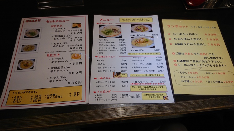 メニューはこんな感じ。餃子・ライス付きで750円からのセットメニューは非常に有難いです![]()