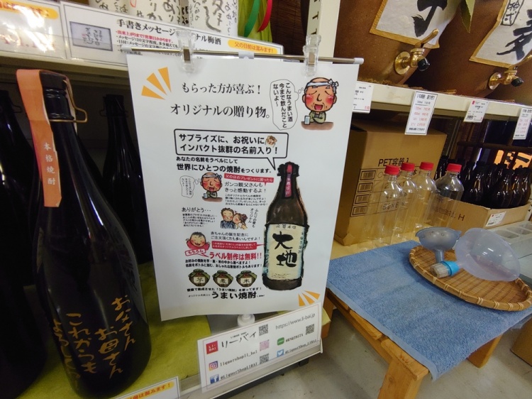 私は、長男と次男が生まれた際の内祝い用にオリジナル焼酎(芋)をリーバイで作らせていただきました。それぞれ、1本ずつ未開封でとってあるので、子供が20歳になった時に開けたいなと思っています