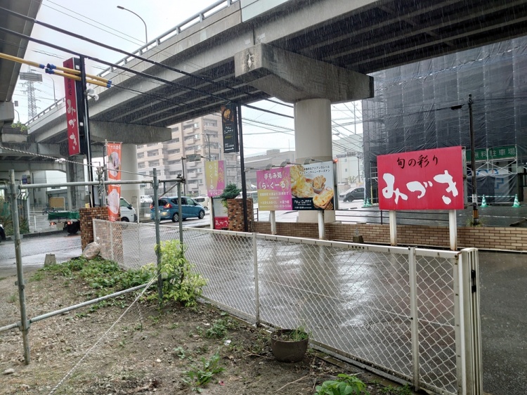 店舗側から道路をみた感じ。水色の車が左折したら、天拝山駅やイオンモール筑紫野方面になります。