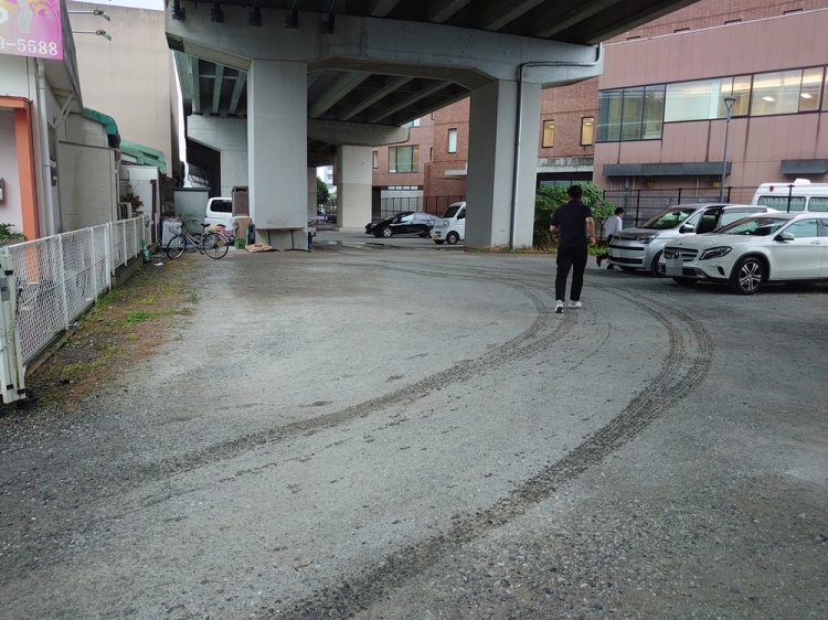 お店前の敷地にはいって、すぐ右手に高架下に駐車場があります。