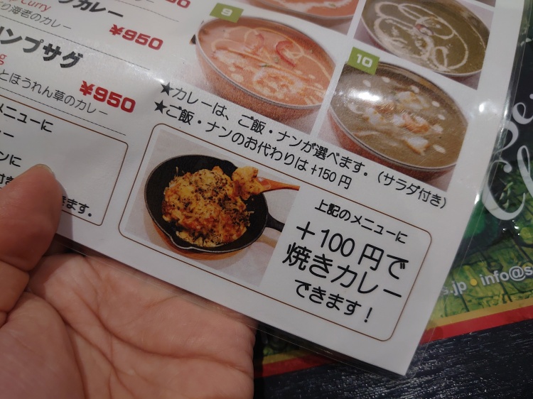 ちなみに、オプションメニュー的に、ご飯を選んだ時の大盛りや、ご飯やナンの御代わり、セットのプレーンナンをチーズナンに変えたり、焼きカレーにしたり、ドリンクセットにしたりと、色々と用意されていました。
