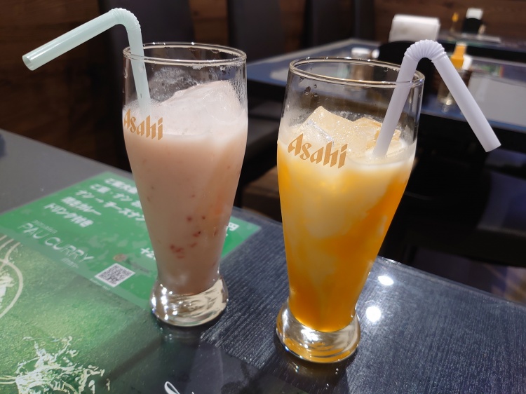 妻が左のストロベリーラッシー、私が右のマンゴーラッシーをオーダー。