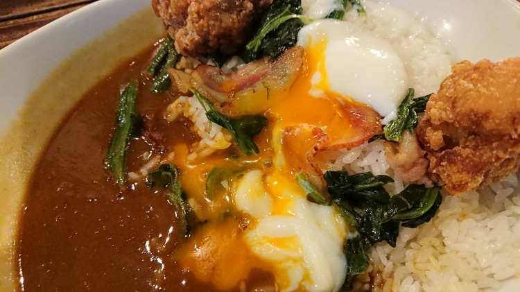 トッピング内容は、唐揚げ、ベーコン、ほうれん草、半熟卵です。